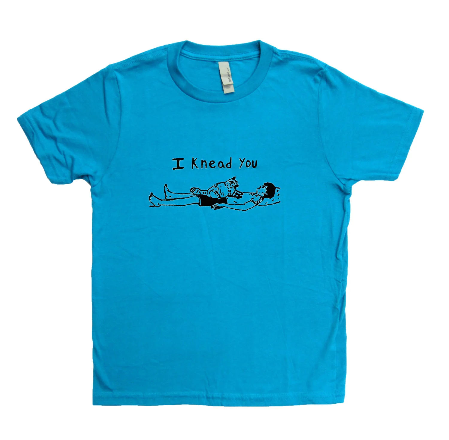 The pun on this was inspired by my Maine Coon cat who loves to knead my boyfriend. I was thinking about how kneading is a sign of love and that 'needing' a person is too. Hence, this shirt was born. The design was drawn free hand and then screenprinted onto the shirts with water insoluble ink so that the shirt can be put through the wash machine without consequence.