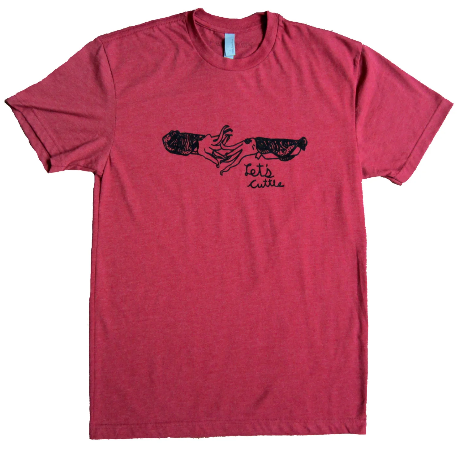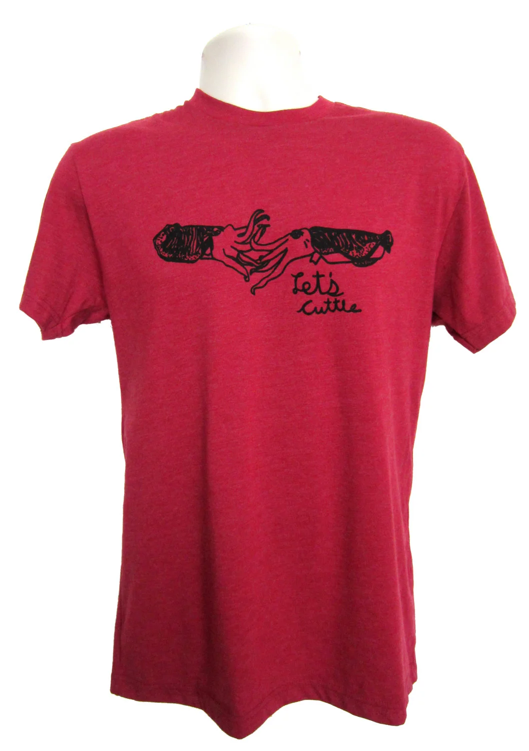 This Lets Cuddle shirt features a favorite marine biology focused pun of mine: Cuddling cuttlefish. The cuttlefish was handdrawn on to a silkscreen for screenprinting on to this super soft shirt. Buy this as a treat for yourself or as a gift for someone who you'd love to snuggle!