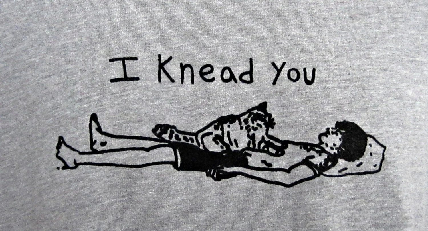 This funny cat shirt features a romantic pun (I need you / I knead you). The pun on this shirt was inspired by my Maine Coon cat who loves to knead my husband. Both "needing" and "kneading" a person are a sign of love!