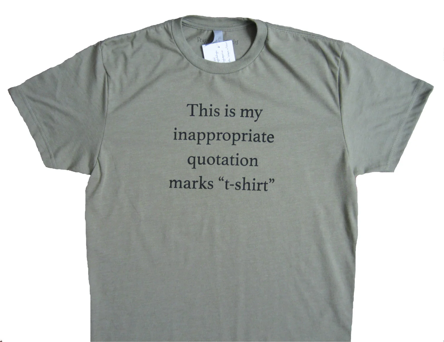 I don't know about you, but inappropriately used quotation marks drive me crazy. There is a car dealership right next to my apartment that I walk by every day on my way to work. There are these ridiculous ads written in the windows that say things like: "new" "car" with "few miles" and "sunroof". What exactly do they think quotation marks signify?! Is the car not actually new? Are you saying it is not actually a car?! If this sort of thing bugs you too, this shirt is for you!