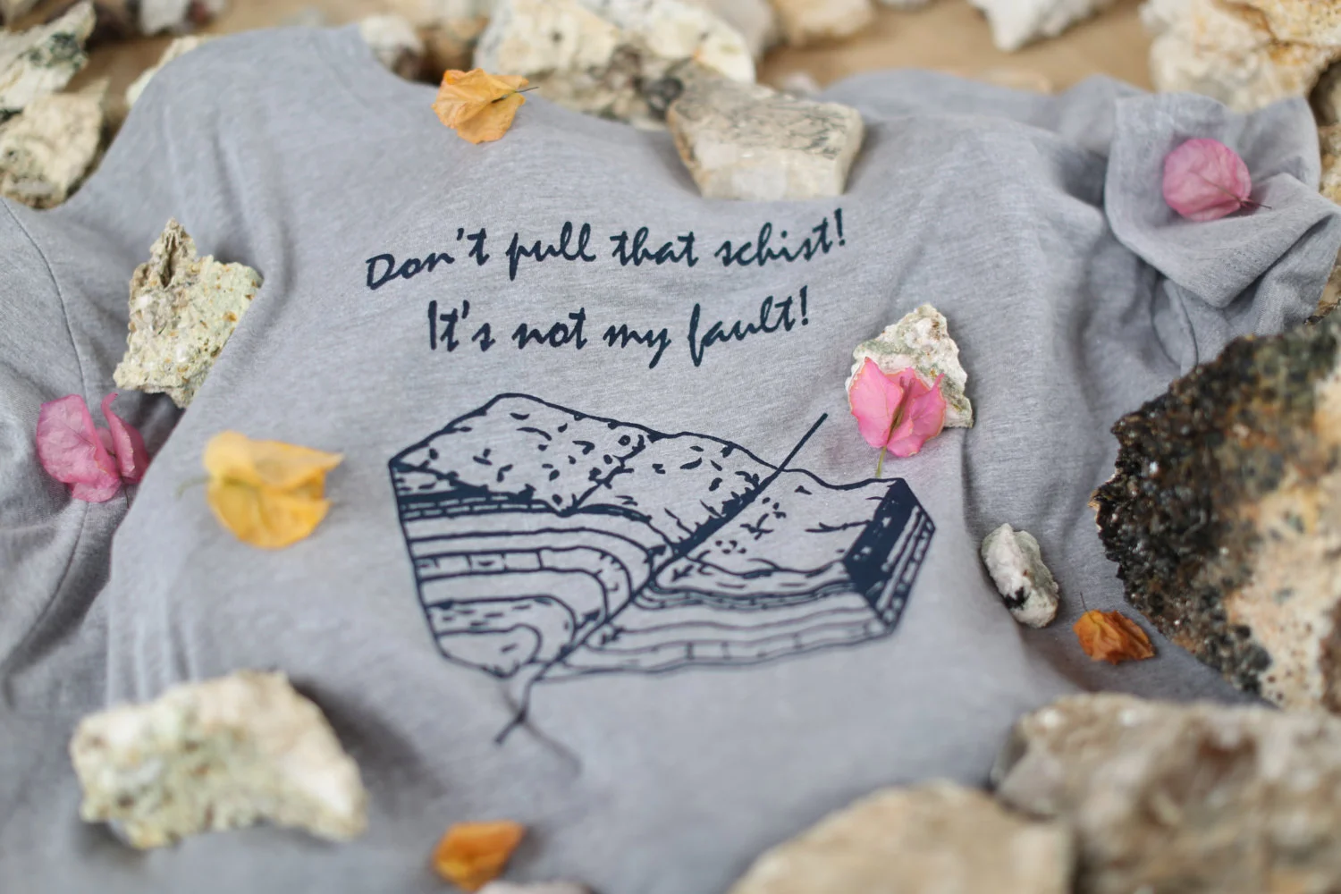 This shirt is great gift for anyone with an interest in geology or puns! This geology tshirt shows schist, a type of metamorphic rock, and a fault, which is a crack in the Earth's crust.