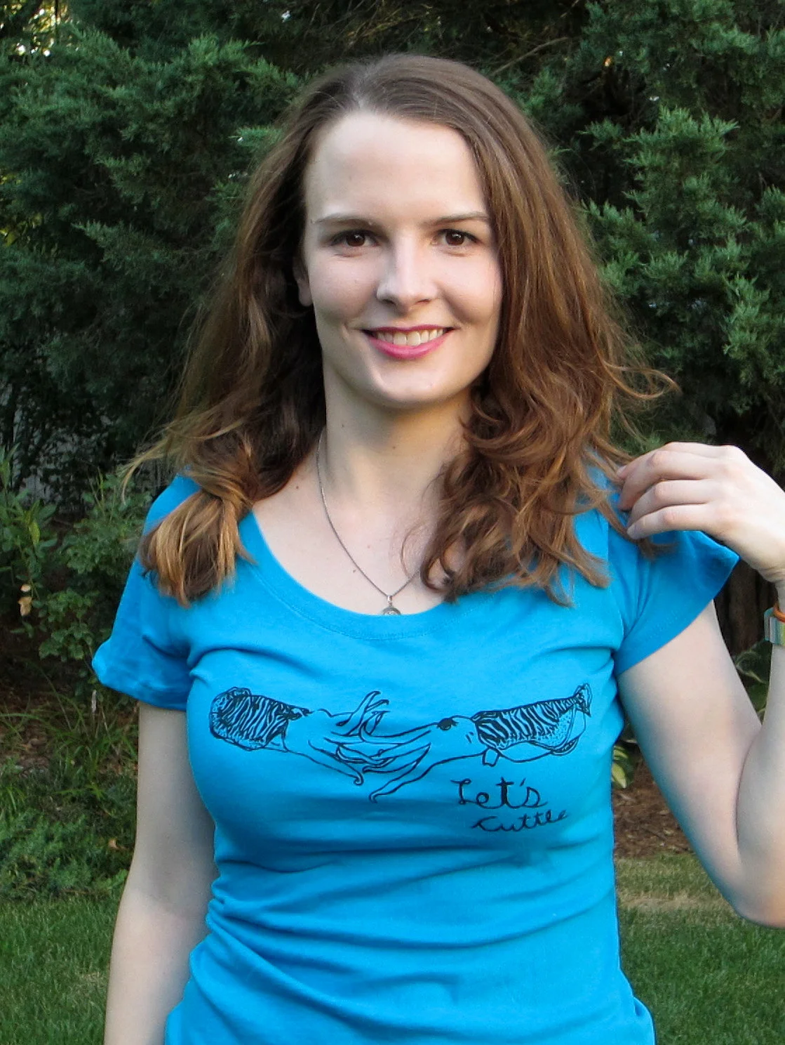 This science shirt features one of my favorite science play on words: Cuddling cuttlefish. I drew the cuttlefish free-hand and then transferred it onto a screen for printing. The ink used is water insoluble and thus the shirt can be machine washed without worry.